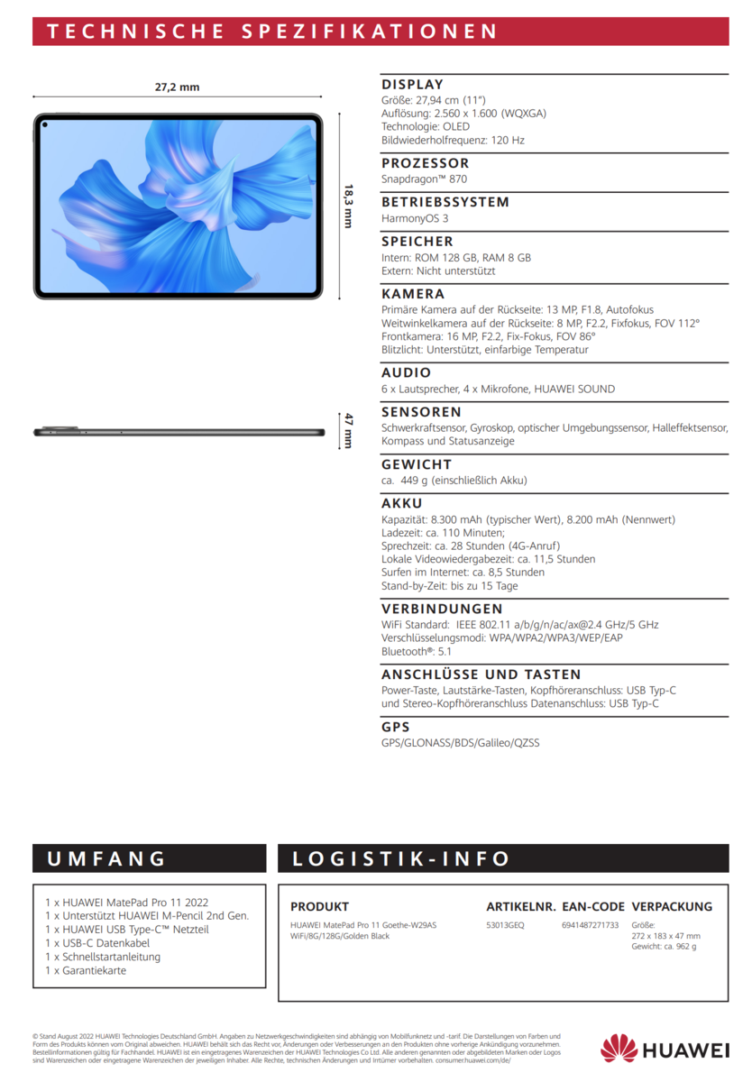 华为MatePad Pro 11将于9月30日上市,起价649欧元。预购将于9月2日至9月29日在华为在线商店上线。预购者可以免费获得华为第二代M-Pencil优雅版(99欧元)和一个对开盖(39欧元),以及华为关怀延长保修的50%折扣。该公司还将在2022年秋季推出MatePad Pro 12.6。