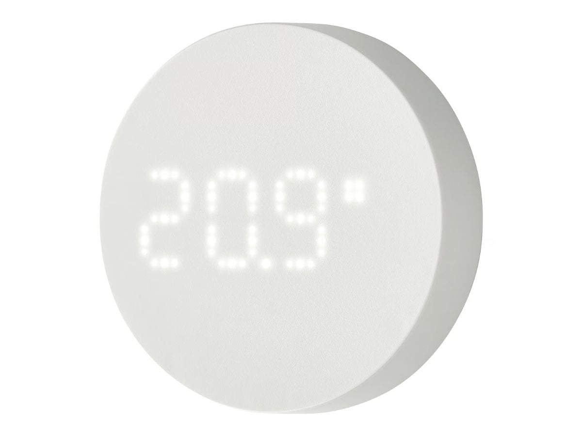 宜家的 Timmerflotte 是一个圆形装置,正面有一个数字显示屏。用户只需按下一个按钮,就可以在测量当前室内温度和湿度之间循环切换。它可以连接到宜家 Dirigera 中枢,通过宜家家居智能应用程序实现远程管理和智能设备连接。