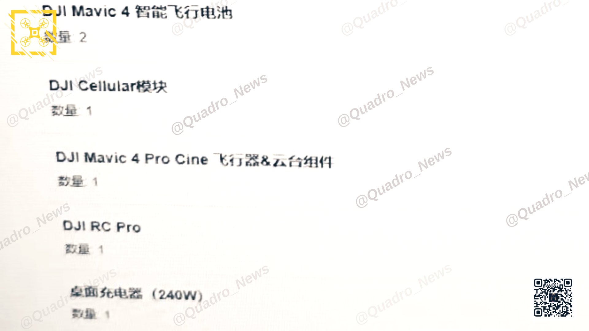 根据新的传言,Mavic 4 Pro 将不会与更便宜的 Mavic 4 同时推出。相反,普通版 Mavic 4 Pro 似乎会有 Cine 版加入。此外,Mavic 4 Pro Cine 还将配备 Mavic 4 智能飞行电池,该电池可能也会在某个阶段为 Mavic 4 提供支持。@Quadro_News 在 X 上分享的同一张图片还强调了即将发布的 Cellular 和 RC Pro 配件,以及 240 W 桌面充电器。