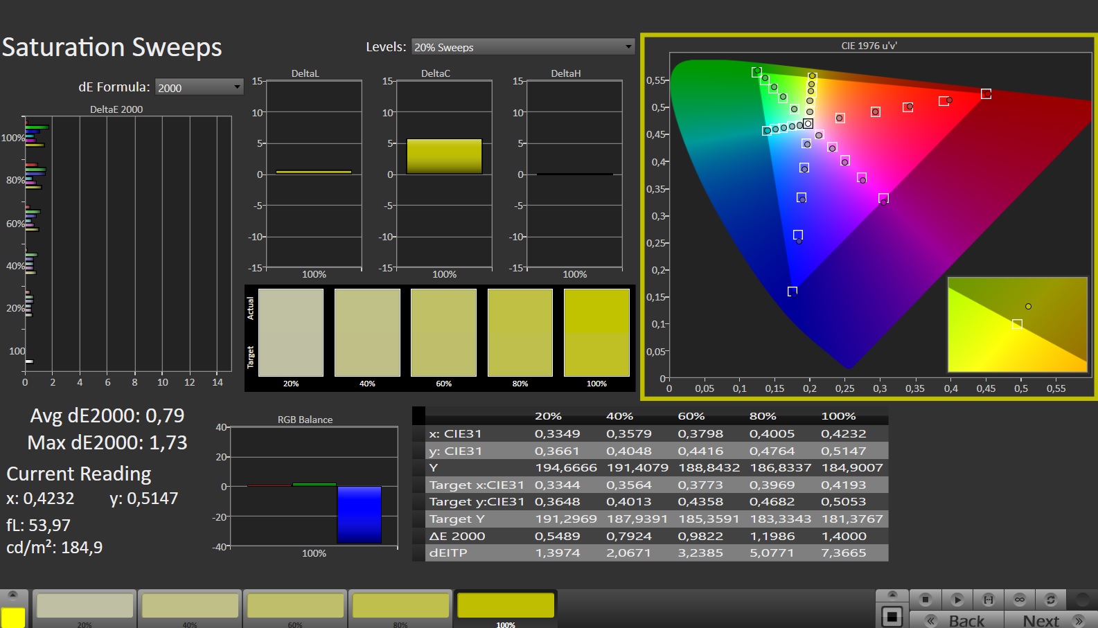 前工作,屏幕已经有了很好的色彩描绘:大约1.7的偏差是可以接受的(DeltaE<3)。校准会导致1.13的较小偏差和更平衡的灰色调。