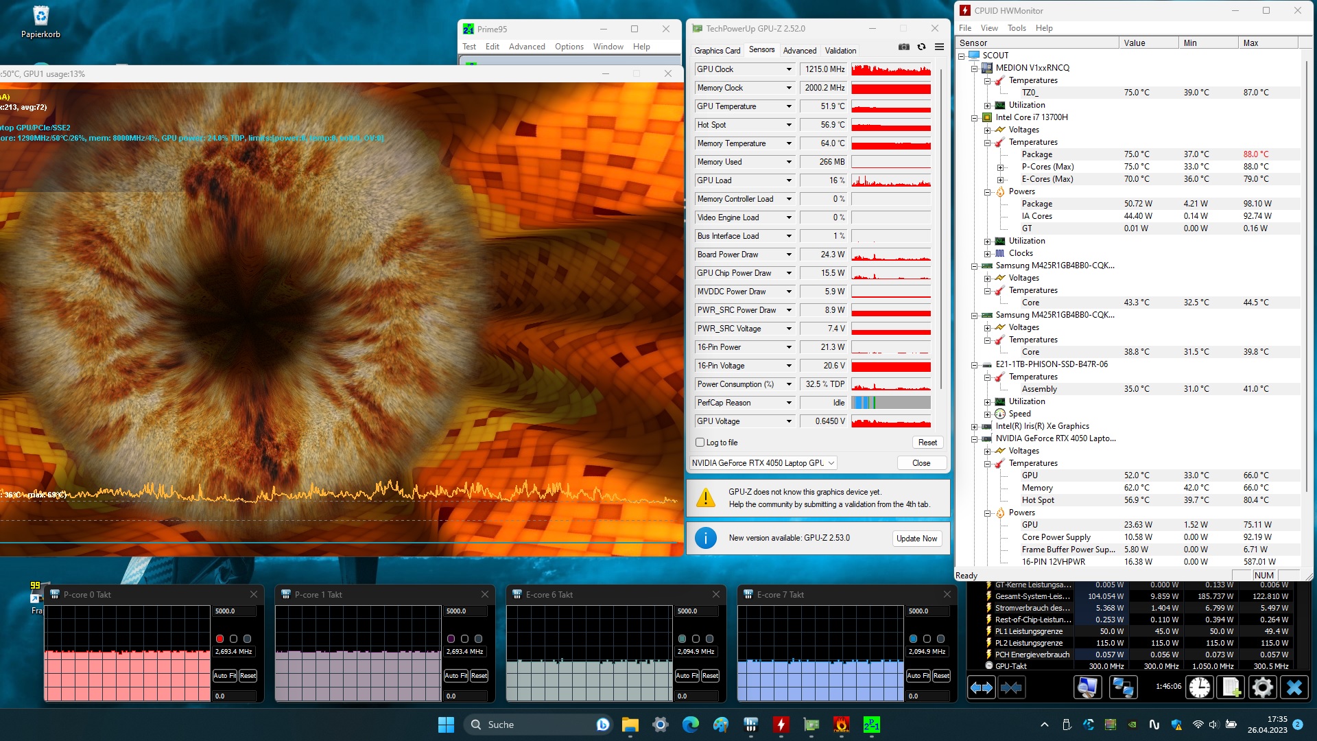 | Medion Erazer Scout E20 i7-13700H, GeForce RTX 4050 Laptop GPU | Gigabyte G7 KE i5-12500H, GeForce RTX 3060 Laptop GPU | MSI Katana 17 B13VFK i7-13620H, GeForce RTX 4060 Laptop GPU | Asus TUF Gaming A16 FA617 R7 7735HS, Radeon RX 7600S | Lenovo Legion 5 15IAH7H 82RB i7-12700H, GeForce RTX 3060 Laptop GPU | Acer Nitro 5 AN515-46-R1A1 R7 6800H, GeForce RTX 3070 Ti Laptop GPU | Average NVIDIA GeForce RTX 4050 Laptop GPU | Average of class Gaming | |