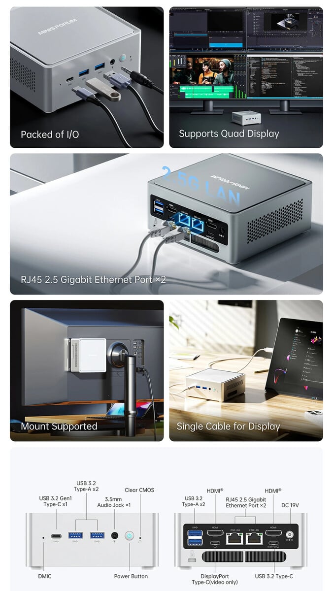 此外,NAB3R 还支持升级存储和内存,不过后者最高只能升级到 64 GB DDR4-3200。尽管如此,Minisforum 还是为迷你 PC 的 M.2 2280 SSD 配备了主动冷却解决方案,并在其底部安装了一个大型涡轮风扇。如下图所示,NAB3R 的后侧也不乏端口。