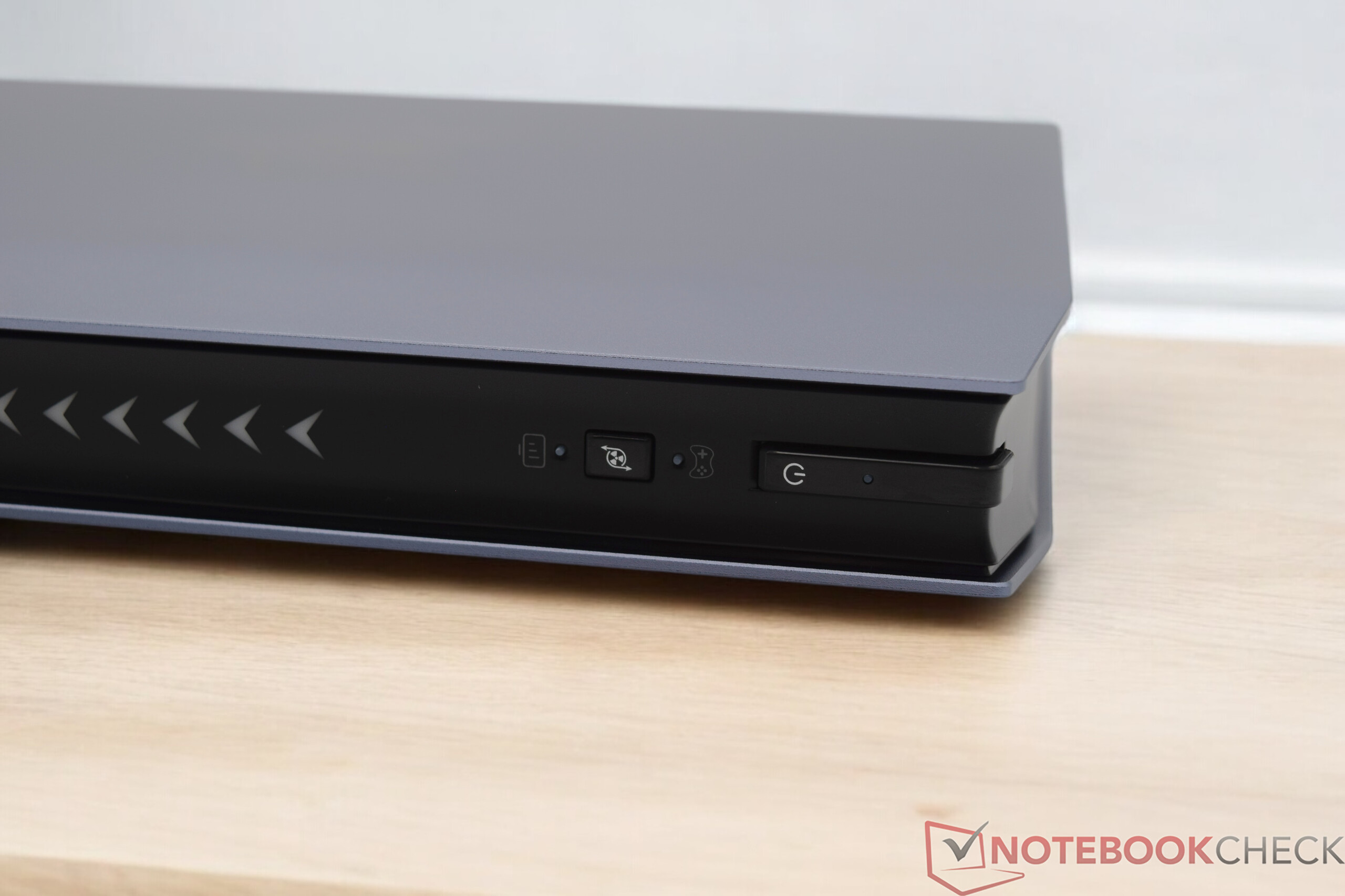 Minisforum AtomMan G7 Ti 的外壳设计现代、紧凑,兼具功能性和美观性。外壳本身专为垂直使用而设计,因为水平使用会遮住通风口。底座可确保稳固的支架,并用螺钉固定在设备上。材料选用塑料和铝。蓝灰色的侧面元件由铝制成,给人一种高品质的感觉。制造商在正面安装了一个小型发光元件,可通过控制中心进行控制。