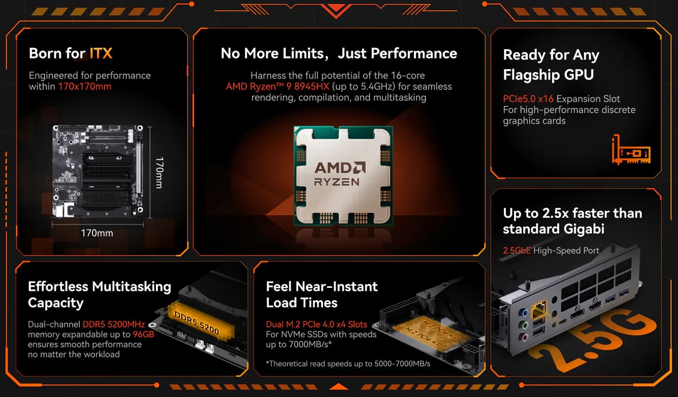 Minisforum 正式推出新款 MoDT 主板 BD895i SE。它采用了 AMD Ryzen 9 8945HX,这是一款来自 Dragon Range Refresh 的 CPU,拥有 16 个 Zen 4 核心。通过两个插槽,它可以搭配高达 96 GB 的 DDR5 内存,运行频率为 5,600 MHz。