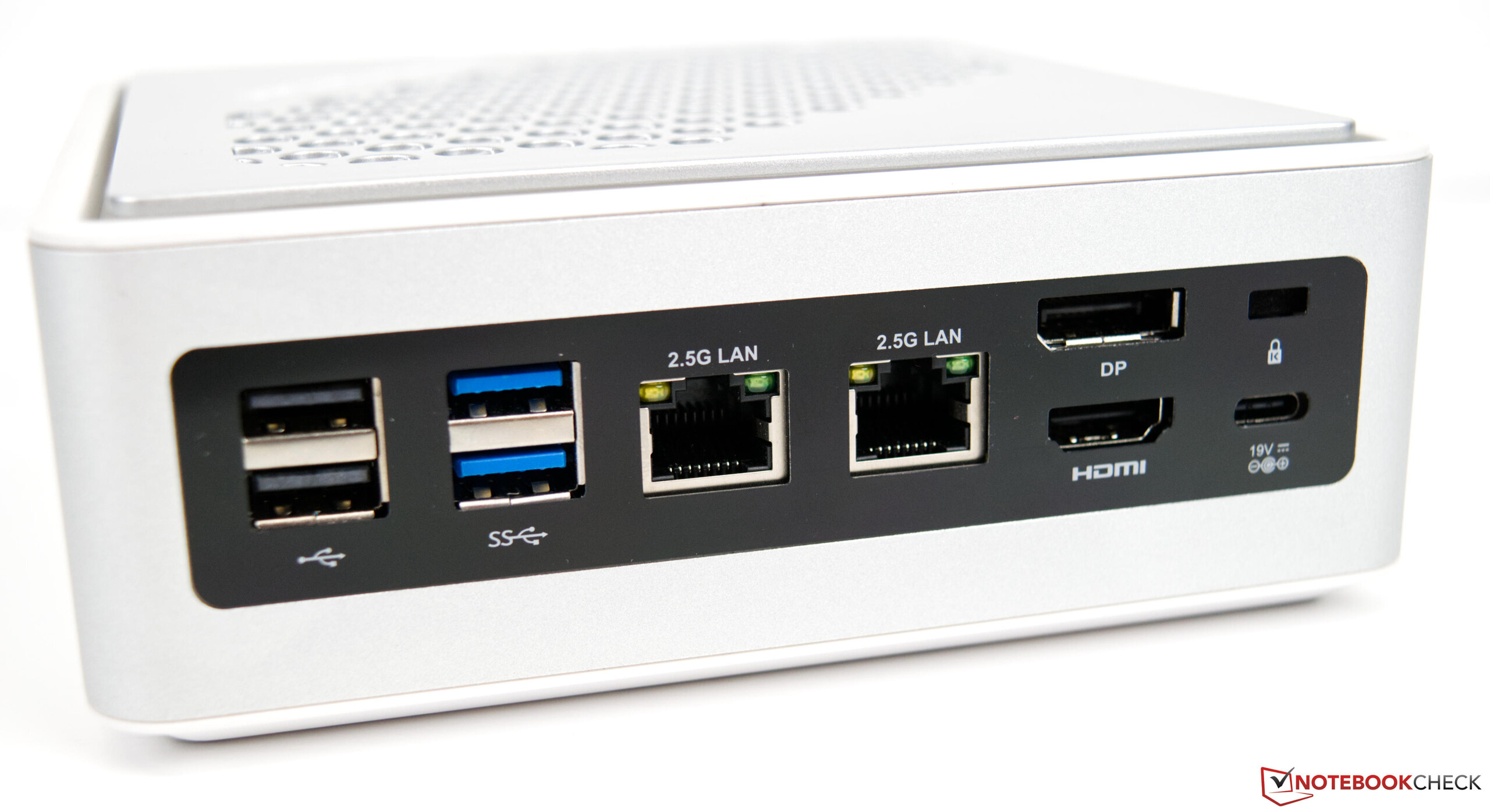 在外部连接方面,EliteMini HM50为连接其他设备提供了多种选择。总共有六个USB-A接口,这应该是绰绰有余的。还有雷电4支持,可以连接外部扩展坞解决方案,从而实现了广泛的选择,以扩大EliteMini TH50的连接。我们还测试了一个外部GPU解决方案,看看这个小系统的游戏性能如何。还有两个2.5G以太网端口,以及一个HDMI和一个DisplayPort。那些同时使用Thunderbolt端口进行图像输出的人,可以用EliteMini TH50同时驱动多达三个显示器。