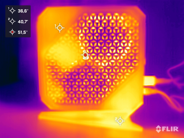 (±) The bottom heats up to a maximum of 43 °C / 109 F, compared to the average of 36.4 °C / 98 F