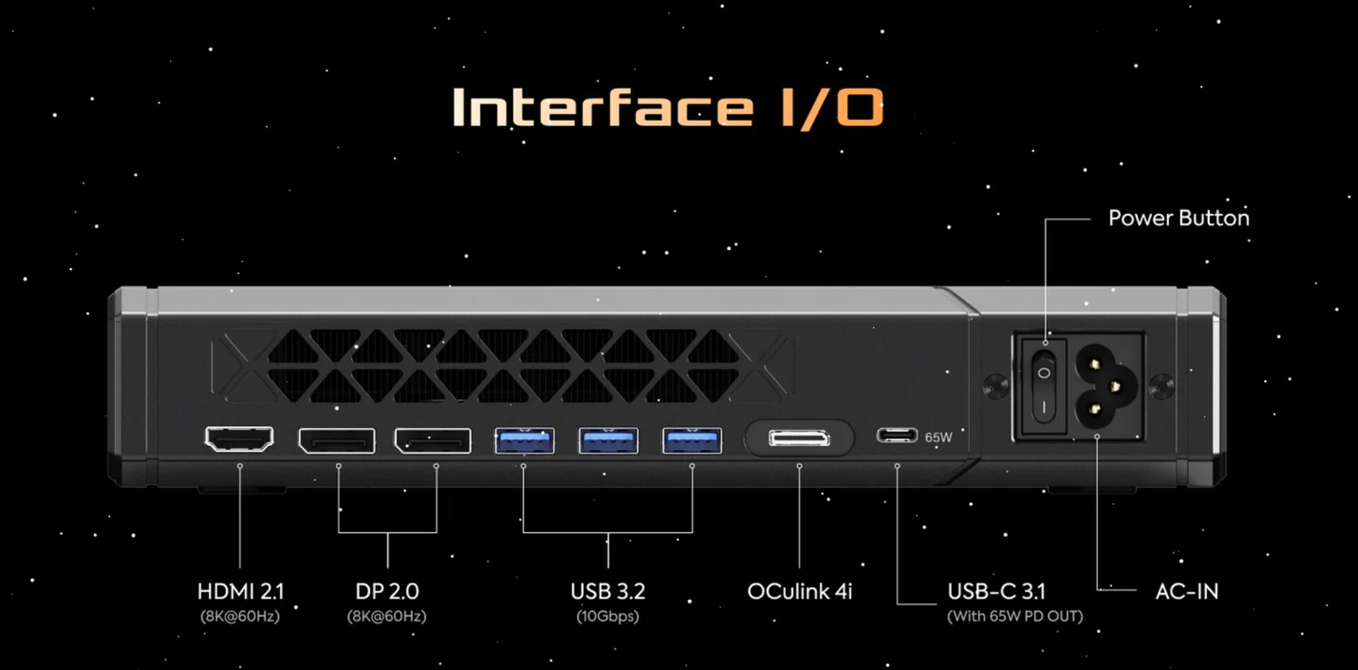 当看到它的外部接口时,很快就会明白这不仅仅是一个简单的 eGPU,因为除了三个显示器接口外,它还配备了三个 USB-A 接口。eGPU 可以通过 OCuLink 连接,但遗憾的是,这是唯一的选择。这是一个遗憾,因为它大大限制了 eGPU 的使用。其他型号,如 GPD G1还可以通过 USB4 连接。与 OCuLink 相比,USB4 的带宽较低,因此性能会降低约 10%。使用 USB-A 端口时需要注意:如果要使用这些端口,除了 OCuLink 连接外,还必须通过 USB-C 连接 Minisforum MGA1。