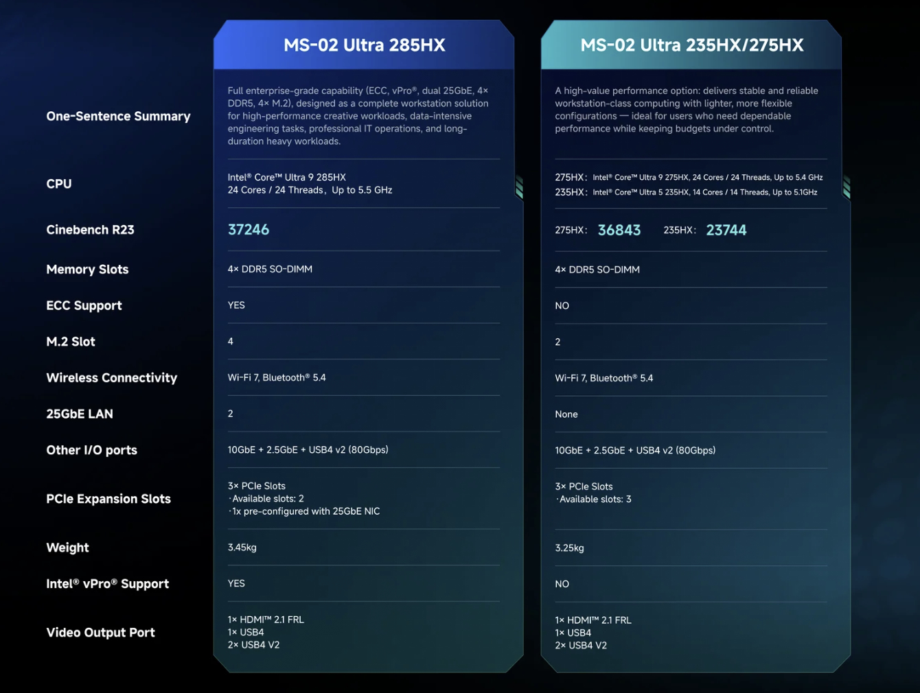 据 Minisforum 报道,高端 Core Ultra 9 285HX变体在 Cinebench R23 中的得分应超过 37,000 分,与 Ryzen AI Max+ 395 相比,性能优势约为 3.5%。 Ryzen AI Max+ 395.此外,MS-02 Ultra 配备 25 Gbps 网络、350 W 内置 PSU 和 PCIe x16 接口,为双插槽显卡提供了足够的空间。此外,Minisforum 还提供了四个 M.2 插槽、USB v2 端口和 Wi-Fi 7 连接。