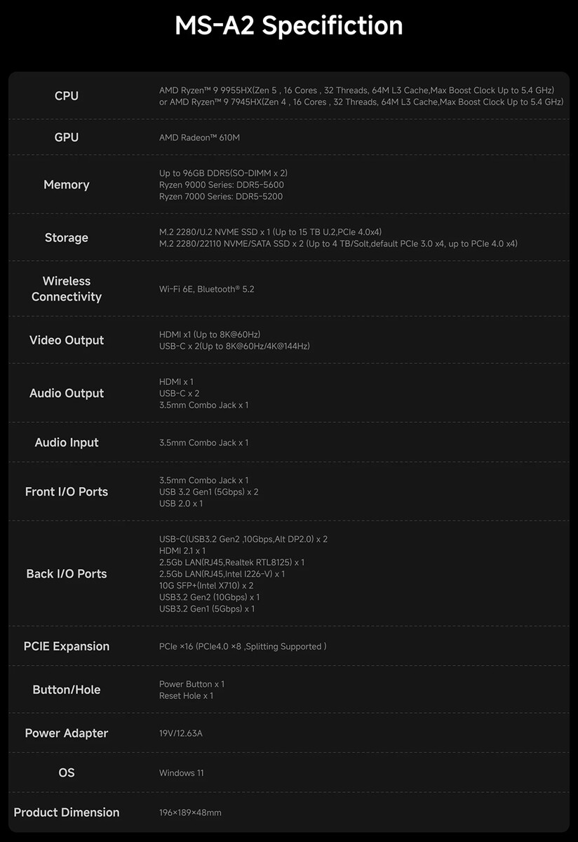 这款处理器是 AMD Fire Range 系列中的高端产品,拥有 16 个 Zen 5 核心和 Radeon 610M。虽然 iGPU 并不值得一提,但与前代产品一样 前代由于内置的 PCIe x16 插槽支持 PCIe 4.0 x8,MS-A2 可以配备独立 GPU(dGPU)。