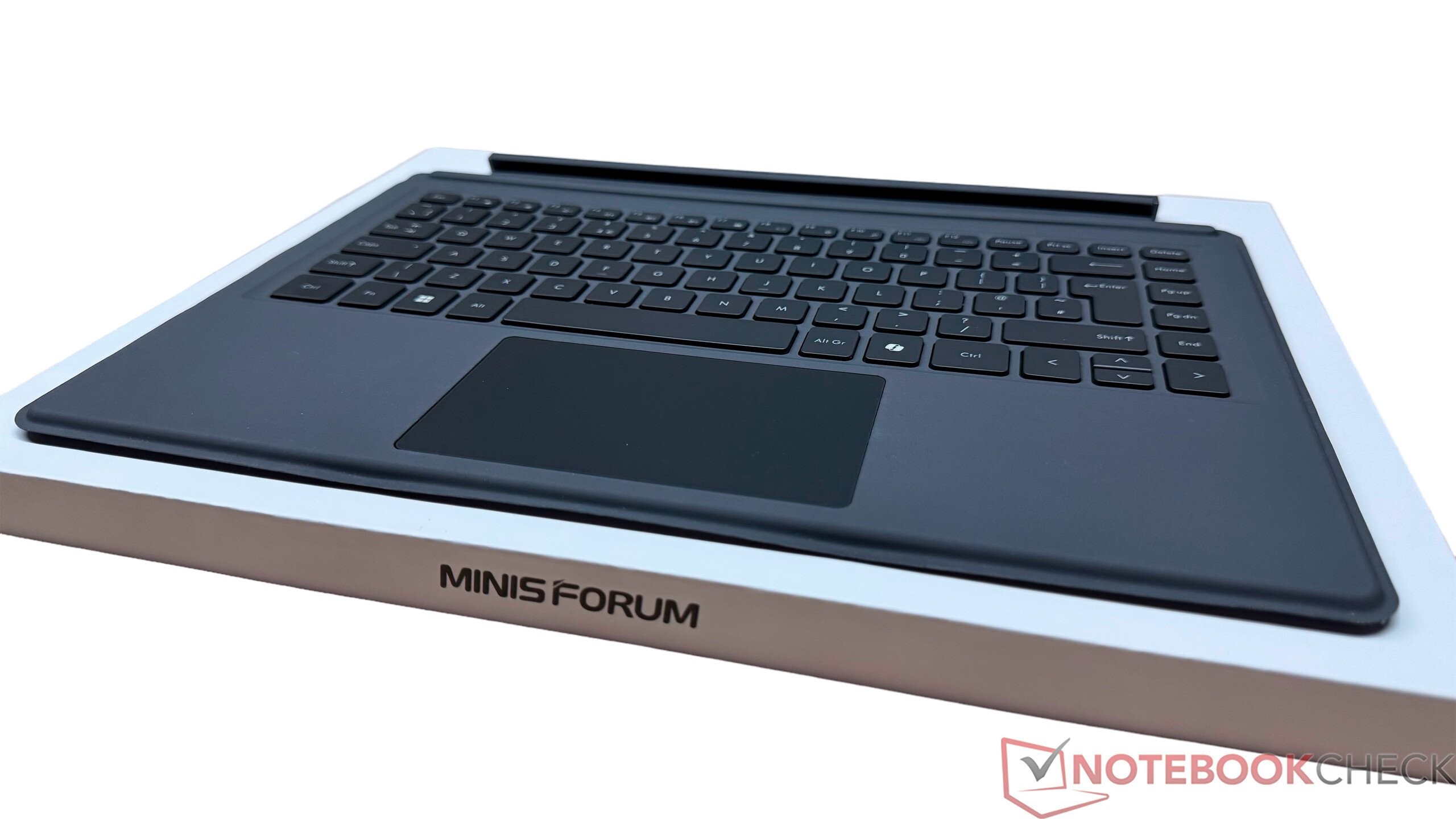 Minisforum V3 的外壳由镁合金制成,这意味着它在保持轻巧的同时非常稳定。平板电脑本身非常耐扭曲,而键盘则更容易扭曲。它没有像微软 Surface 那样的集成支架。V3 只能通过磁性后盖支撑起来。在这样做时,你需要格外小心,不要盖住两个风扇的通风口。我们一开始也用错了后盖,不得不咨询制造商。一开始,盖子本身内置的铰链相当僵硬,这也是我们最初无法将其折叠到所需程度的原因。作为一种直观的解决方案,你往往会错误地使用后盖,从而导致散热效果大打折扣。