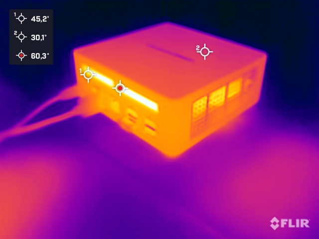 在我们的测试中,Minisforum Venus Series UM790 Pro 的机箱仅有一点点发热。在负载情况下,共有两个风扇负责提供低温。一个风扇通过设备底部冷却内存和固态硬盘,另一个风扇通过顶部冷却 SoC。在实际使用中,我们已经注意到两块固态硬盘的散热效果都很好,没有因为温度过高而出现任何节流现象。AMD Ryzen 9 7940HS 的散热也很可靠,在 Prime95 压力测试中,它的最高温度达到了 84.6 °C。SoC 的最大功率为 65 瓦,也得到了充分利用。SoC 的总功耗平均为 57 瓦。