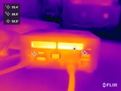 在我们的音量测量中,Minisforum Venus 系列 UN1245 并没有达到我们所习惯的 Minisforum 标准。该系统的音量略高于 32 dB(A),虽然很安静,但仍可听到。如果推动设备,声音会迅速变大,达到 39.8 dB(A)时,声音会明显变大。不过,在压力测试中,声音又略有增大,噪音峰值超过 43 dB(A)。在目前的对比中,我们的评测样品仅在负载情况下优于 Blackview MP200。