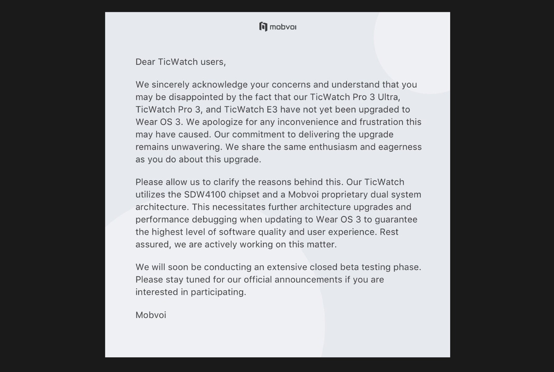 现在,该公司在其全球推特账户上发表声明,公开评论了这一情况.遗憾的是,它没有承诺它将提供操作系统更新的日期。相反,最近的TicWatch型号的Wear OS 3似乎将在谷歌发布Wear OS 4或同等产品后首次亮相。
