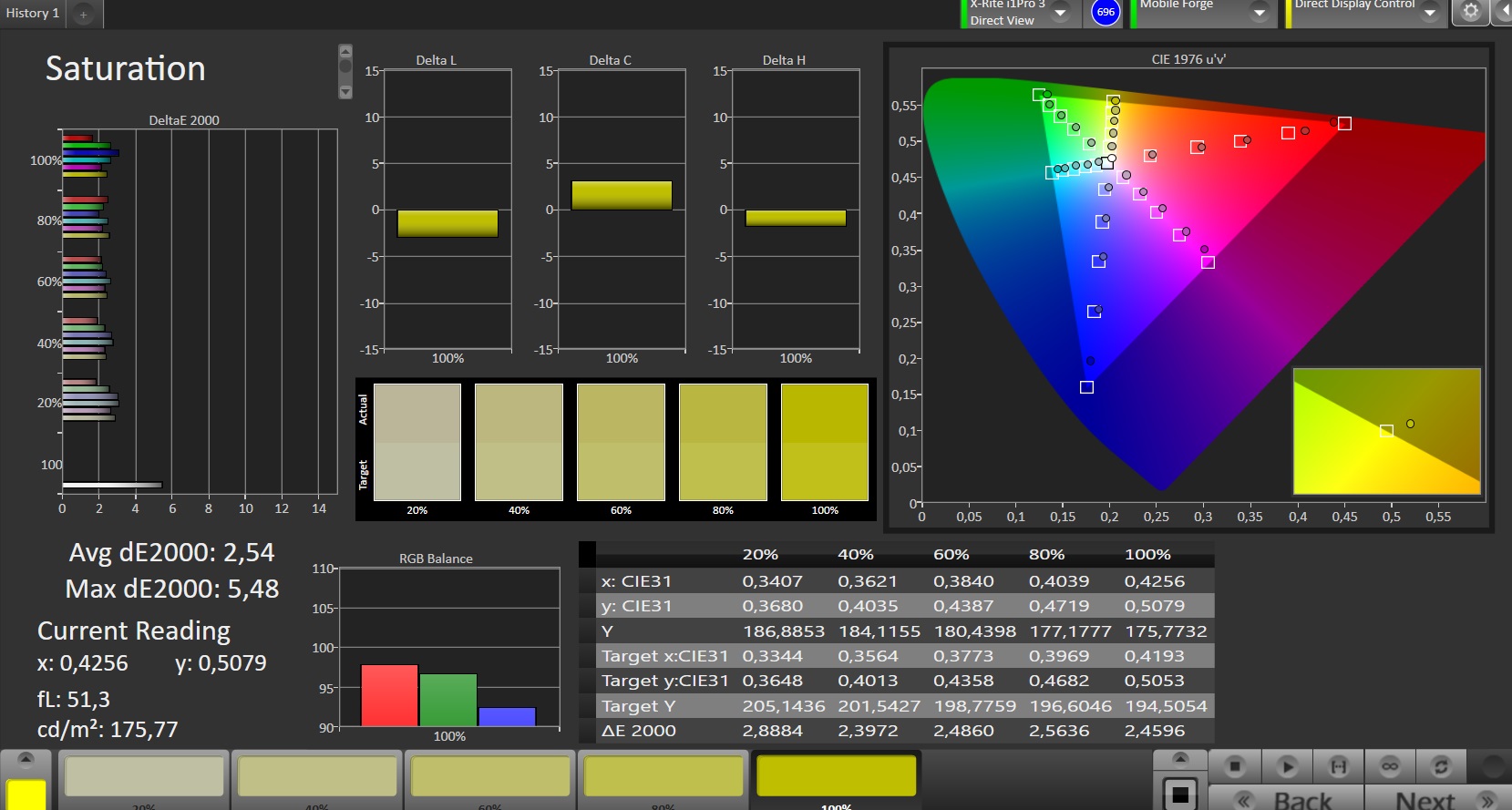 | Colorchecker dE 2000 * | 2.6 | 4.23 -63% | 1.2 54% | 5.54 -113% | 4.62 -78% | 1.1 58% |