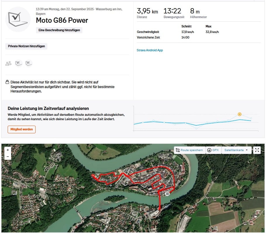 在室外,Moto G86 Power 可以迅速将位置定位在三米左右的范围内。在我们的骑行测试中,定位精度偶尔会有一些偏差,但这款智能手机的精度仍足以满足日常导航的需要。