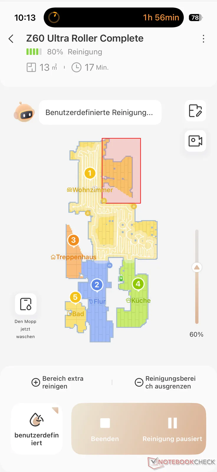 关于拖地功能,我们也有很多正面评价。一般来说,带有滚筒解决方案的机器人吸尘器比带有两个旋转拖把的传统机型拖得更彻底,我们的测试经验也证明了这一点。Mova Z60 Ultra Roller 也是如此。