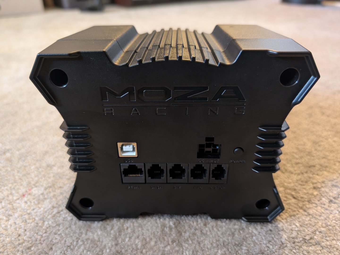 至于轮座本身,全黑色的外壳由航空级铝合金制成,看起来非常坚固。底部有四个螺丝孔,可用于安装桌面和模拟设备。顶部还有两个螺丝孔,用于安装仪表盘配件。背面有一个电源按钮、一个直流输入、一个用于连接电脑电缆的 USB Type-B 接口和五个附件接口。前部有电机轴和快速连接装置,Moza 称 R5 轴距可与大多数方向盘和踏板系统兼容。