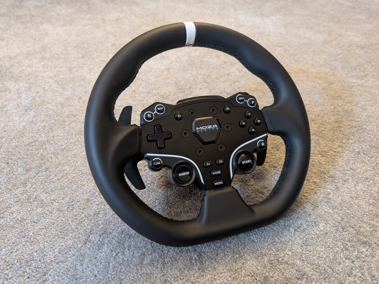 方向盘上有很多按钮,而且大部分按钮都很容易触及。原版捆绑包仅与 PC 兼容,但 Moza 的 ESX 方向盘可使其与 Xbox 兼容。PlayStation 用户只能另寻他处,Moza 的大部分赛车装备都是如此。方向盘上的拨片声音响亮、嗒嗒作响,但反应灵敏、触手可及。但也有一些海绵的感觉。即使在启动后,也有相当大的行程。有一个 ES Formula Wheel 附件可用来获得更多 F1 赛车的感觉。安装时需要拧开几个紧固件,但很容易。此外,它还附带了大量用于重新命名按钮的贴纸。