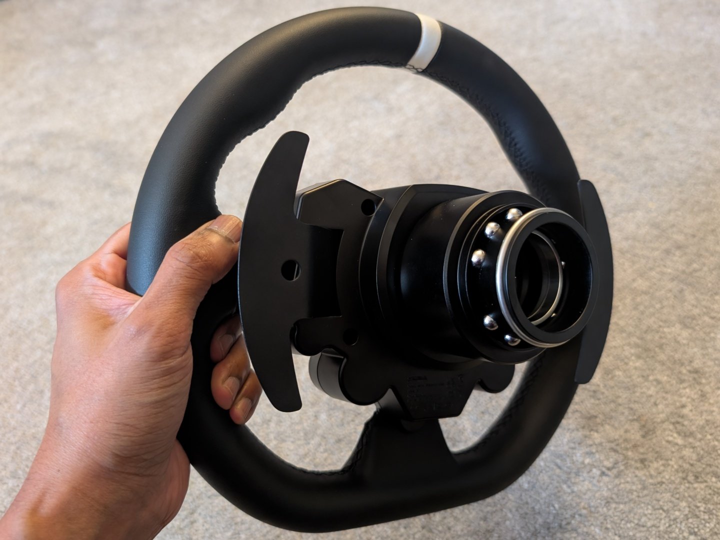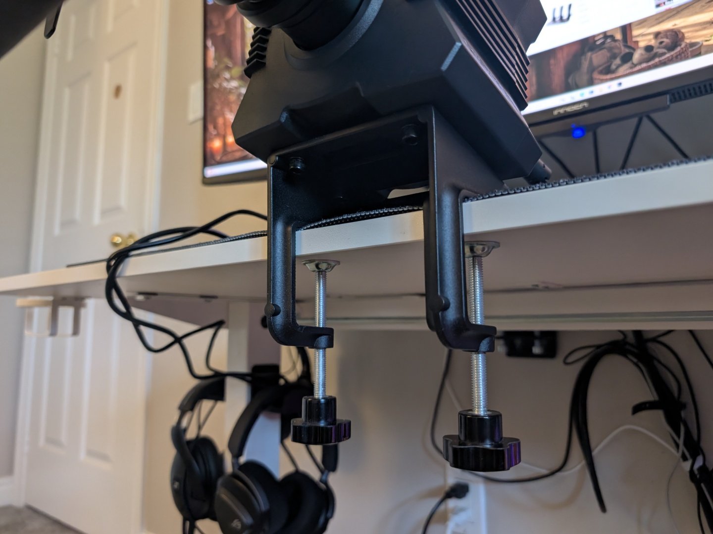 Moza 进入模拟赛车领域已有一段时间,拥有自己独特的设计。R5 的设计与 R9 和 R12 轴距相同,但更为紧凑。它的尺寸和重量使其更便于使用附带的重型钢夹安装在桌面上。夹具本身有一个 15 度的角度,使方向盘的位置更符合人体工程学。不过,除了不能调节之外,夹具还有一个问题,那就是螺丝会伸出来一些,有时会碰到腿。但它有足够的空间容纳不同尺寸的桌子,并有泡沫衬垫,不会刮伤桌子。