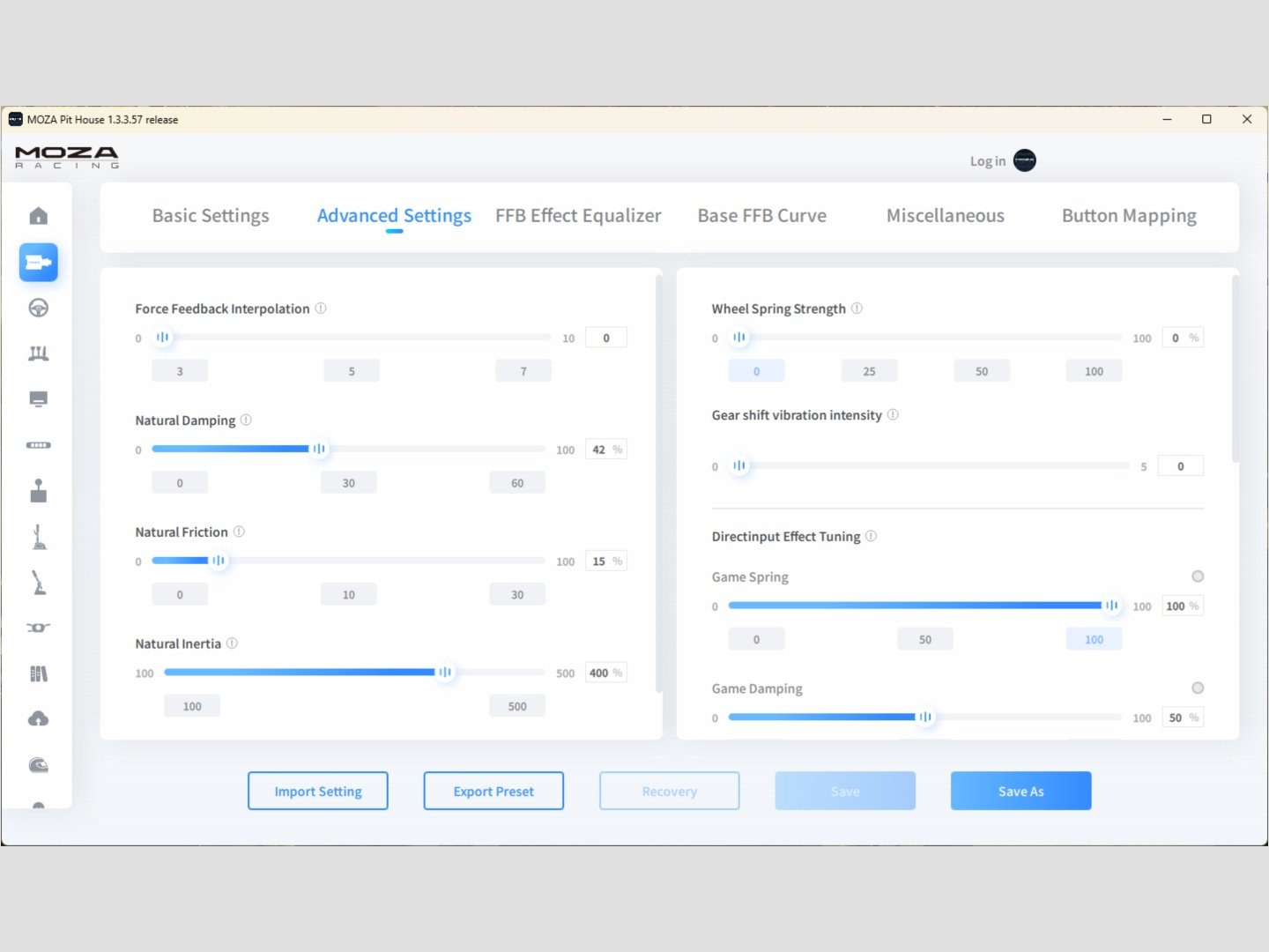 至于 Moza Pit House 软件,您可以对轴距进行细微调整,以个性化反馈的方方面面。该软件易于使用和理解,还可以创建、导入和导出配置文件。方向盘的旋转和 LED 灯也可以根据不同的转速范围和颜色进行定制。