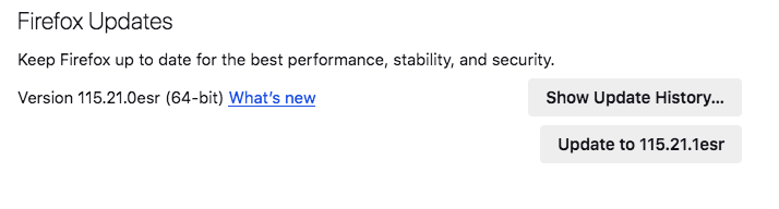 Mozilla 将通过 Firefox ESR 频道提供关键安全更新,直至 ESR 版本 115(2025 年 8 月)结束。在此之后,将不再提供任何安全更新,我们强烈建议你改用受支持的 macOS 版本。