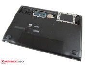 As typical for laptops, the maintenance possibilities are somewhat limited. Like most competitors, the base plate, secured with screws, only gives access to the hard drive slot for 2.5-inch HDDs or SSDs and both DDR3 RAM banks. Inexperienced users can also replace or upgrade components. The cooling system, processor and graphics card regrettably cannot be accessed directly.