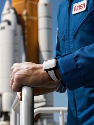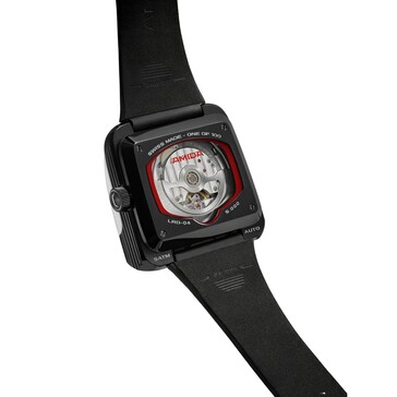 表带采用白色皮革,搭配宇航员常用的尼龙搭扣,可无级调节表带长度。表底由不锈钢制成,可以看到 Soprod Newton P092 机芯,该机芯配备 23 颗红宝石,每 44 小时只需上弦一次。近乎正方形的表壳边长 39 毫米,高 15.6 毫米,重 90 克。