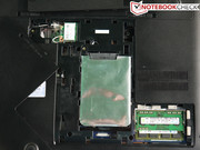 Access to the hard drive, RAM, WLAN module and the optical drive is provided by two maintenance panels. In case users are intending to replace the conventional rotating hard drive for a silent SSD, there are ample options thanks to SATA III. While the limits on extending the permanent memory are more or less unbounded, the maximum RAM capacity is limited to 8 GB. In this case, the included 2 GB module has to be replaced with one that has a capacity of 4 GB.