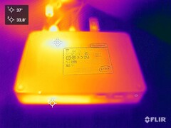 无论安装何种计算元件,英特尔NUC Pro机箱元件在噪音排放方面的表现都是一样的。有时可以测量到最大音量的小波动。然而,即使在平均负载下,噪音水平也已经远远超过40 dB(A)。此外,还有一个相对高频的风扇噪音,这更增加了噪音的主观感受。