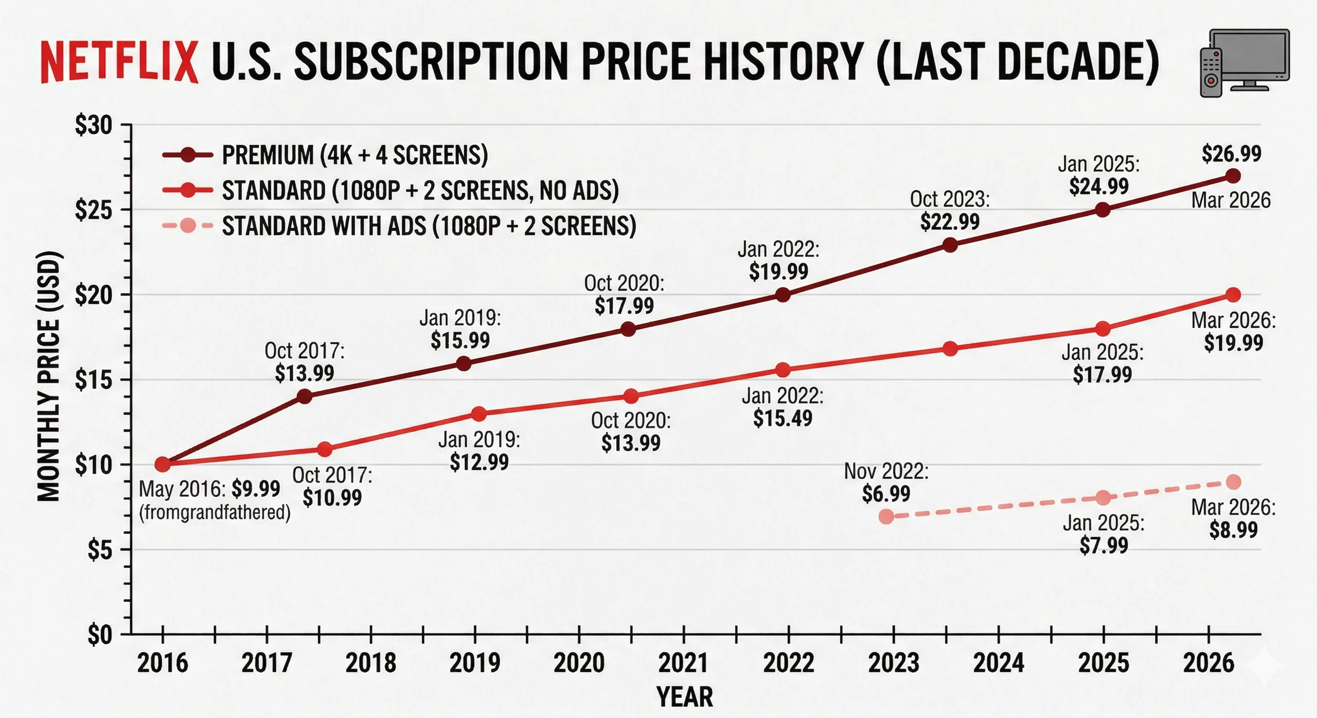 Netflix 刚刚在上调了其美国订阅价格一年内第二次上调。新的计算方式看起来像是对你的硬件直接征税。自 2026 年 3 月 26 日起,高级 4K 级的价格已攀升至每月 26.99 美元,而广告支持的入门级价格则维持在 8.99 美元。这就造成了一个巨大的价格差,基本上迫使人们在两个过去被认为是标准的东西之间做出选择:屏幕的分辨率和使用习惯的私密性。如果你买的是高端笔记本电脑,比如 MacBook Pro M5这样的高端笔记本电脑,Netflix 现在要向你收取高额年费,只为让你看看这块屏幕到底能做些什么。