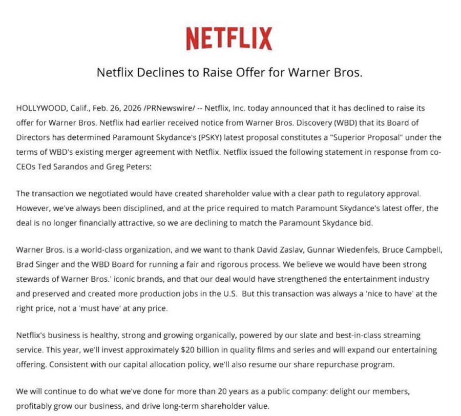 2025 年 12 月 5 日、 Netflix发布官方公告,称该流媒体平台已就收购华纳兄弟(包括其电影和电视工作室、HBO Max 和 HBO)的最终协议进行了全面谈判和融资。这笔现金和股票交易的价值为 827 亿美元(股权价值 720 亿美元)。 然而,这实际上并不是一项最终协议,因为 WBD 的竞标仍未结束,ParamountSkydance 在此期间继续出价。2 月 26 日,华纳兄弟 Discovery 董事会认为派拉蒙的最新出价 "优于 "最初的 Netflix 协议。派拉蒙 Skydance 将以约 1110 亿美元的价格收购 WBD 100%的股份。Netflix 拒绝以更高的出价还击,派拉蒙现在看来准备完全拥有 WBD。
