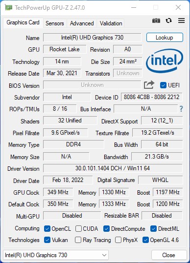 Newsmay Neosmay S2-B560TPM配备了一个英特尔UHD Graphics 730。该集成GPU拥有24个执行单元,最高频率为1200MHz,远远跟不上目前AMD Ryzen APU上的AMD Radeon RX Vega 8的步伐。在英特尔UHD Graphics 730上运行超过办公程序的东西可能不是一个好主意,你可以从它在测试的游戏中的性能概述中看到。
