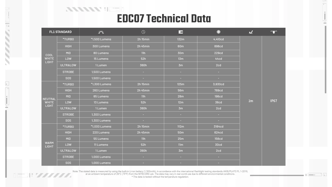 在涡轮增压模式下,只要手电筒不过热,即使电池电量不足也能使用,Nitecore EDC07 总共可以使用 2 小时 15 分钟。输出功率取决于色温,范围在 1,000 到 1,500 流明之间。在 1 流明的最低模式下,可持续使用约 380 小时。运行时间相当复杂,因此我们在本文下面列出了 Nitecore 的运行时间。