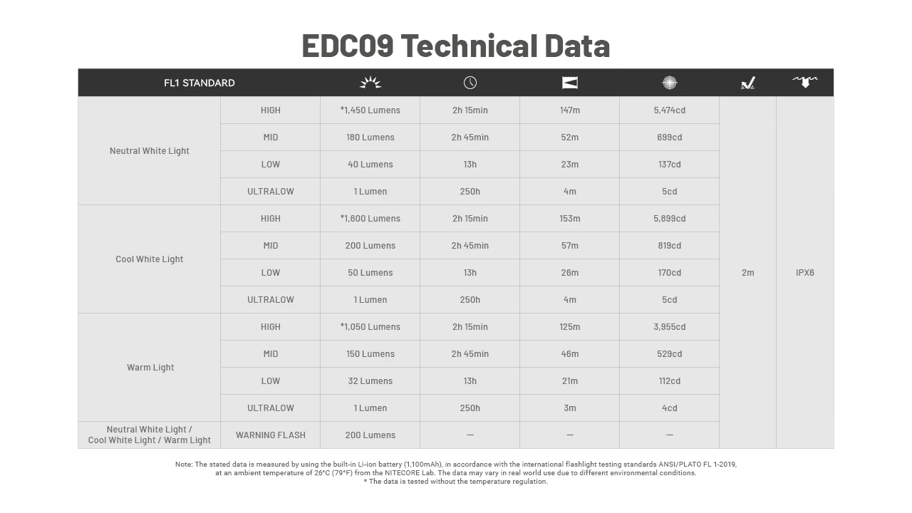 手电筒的防护等级为 IPX6,长度略超过 10 厘米,重量为 114 克(含电池)。电池不可更换,通过 USB-C 接口充电,可以边充电边使用手电筒。无论灯光颜色如何,电池寿命在最亮模式下为 2 小时 15 分钟,在最暗模式下为 250 小时。不过,射程和亮度会受到灯光颜色的影响。有关数据可参见制造商提供的下表。