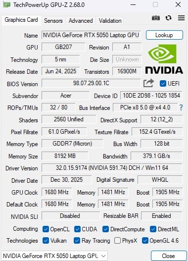 | Acer Nitro V 15 ANV15-52-50S2 Intel Core i5-13420H ⎘ NVIDIA GeForce RTX 5050 Laptop ⎘ 16 GB Memory, 1024 GB SSD | List Price: 1049 EUR | 2.1 kg | 23.5 mm | 15.60" 1920x1080 141 PPI IPS | |