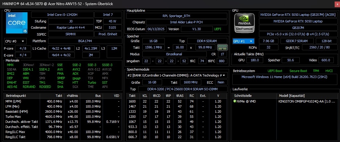 安装的 酷睿 i5-13420H是英特尔新一代 Raptor Lake 处理器中一款不再特别新颖的型号。它具有四个性能核心(带超线程技术)和四个效率核心(不带超线程技术),最多可同时运行 12 个线程。