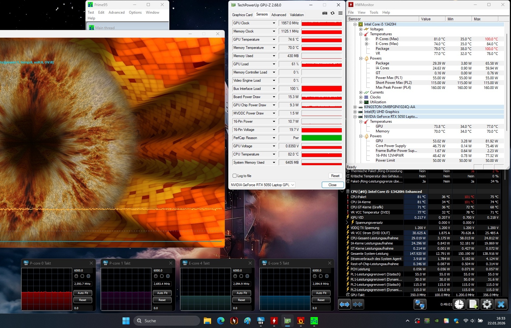 温度符合 RTX 5050 笔记本电脑的预期。在闲置状态下,机箱依然凉爽宜人。