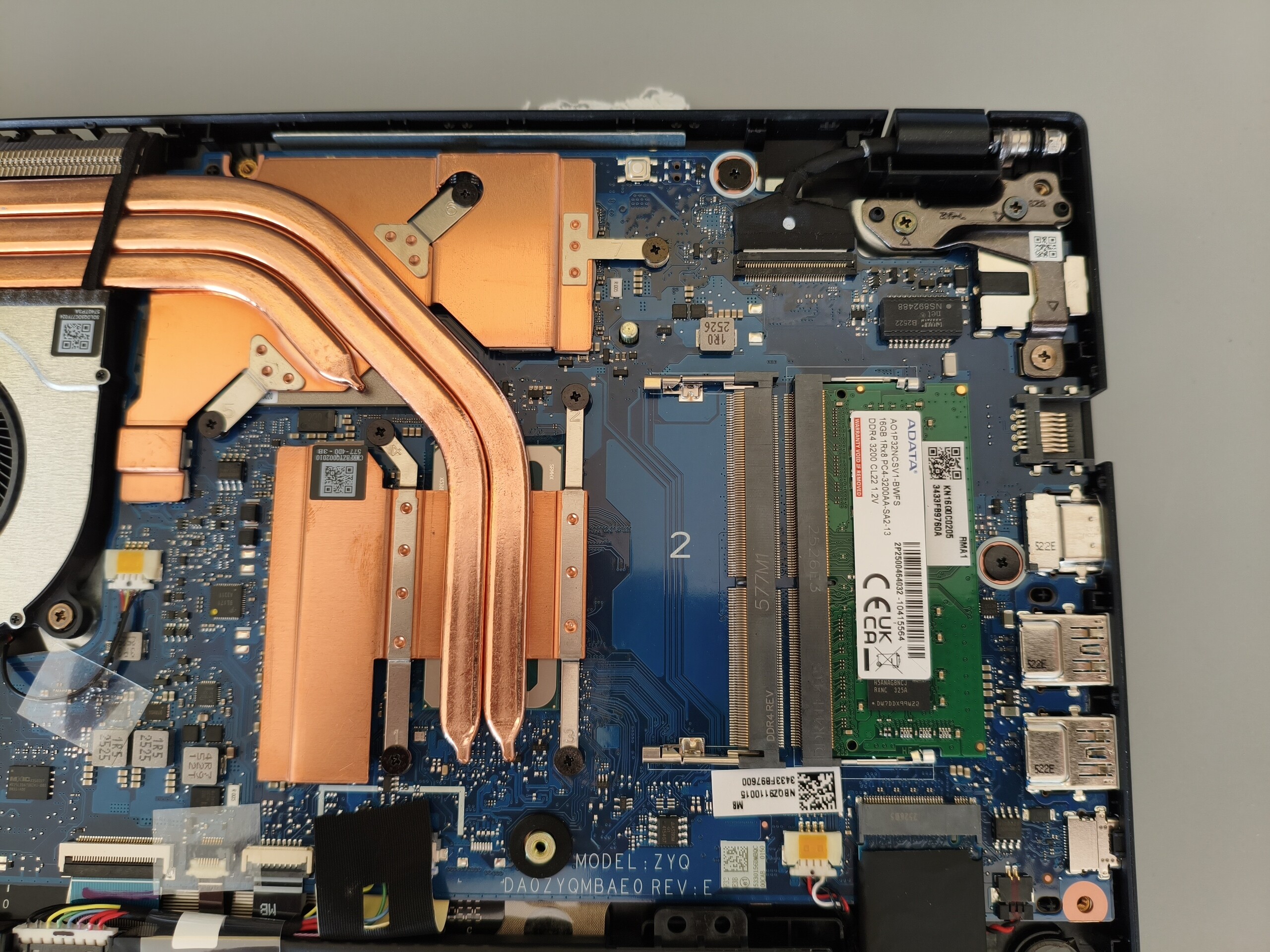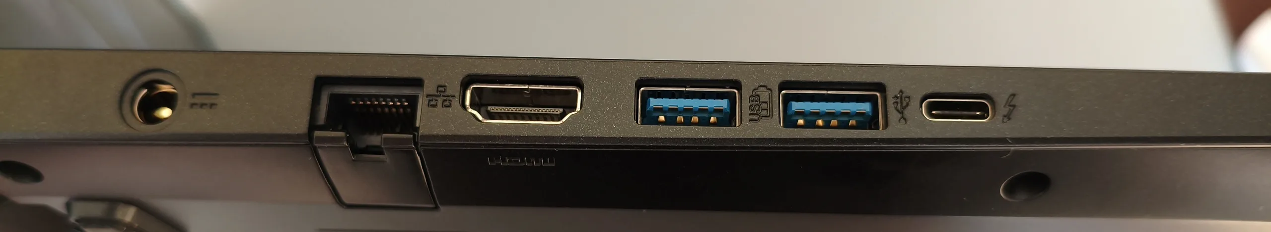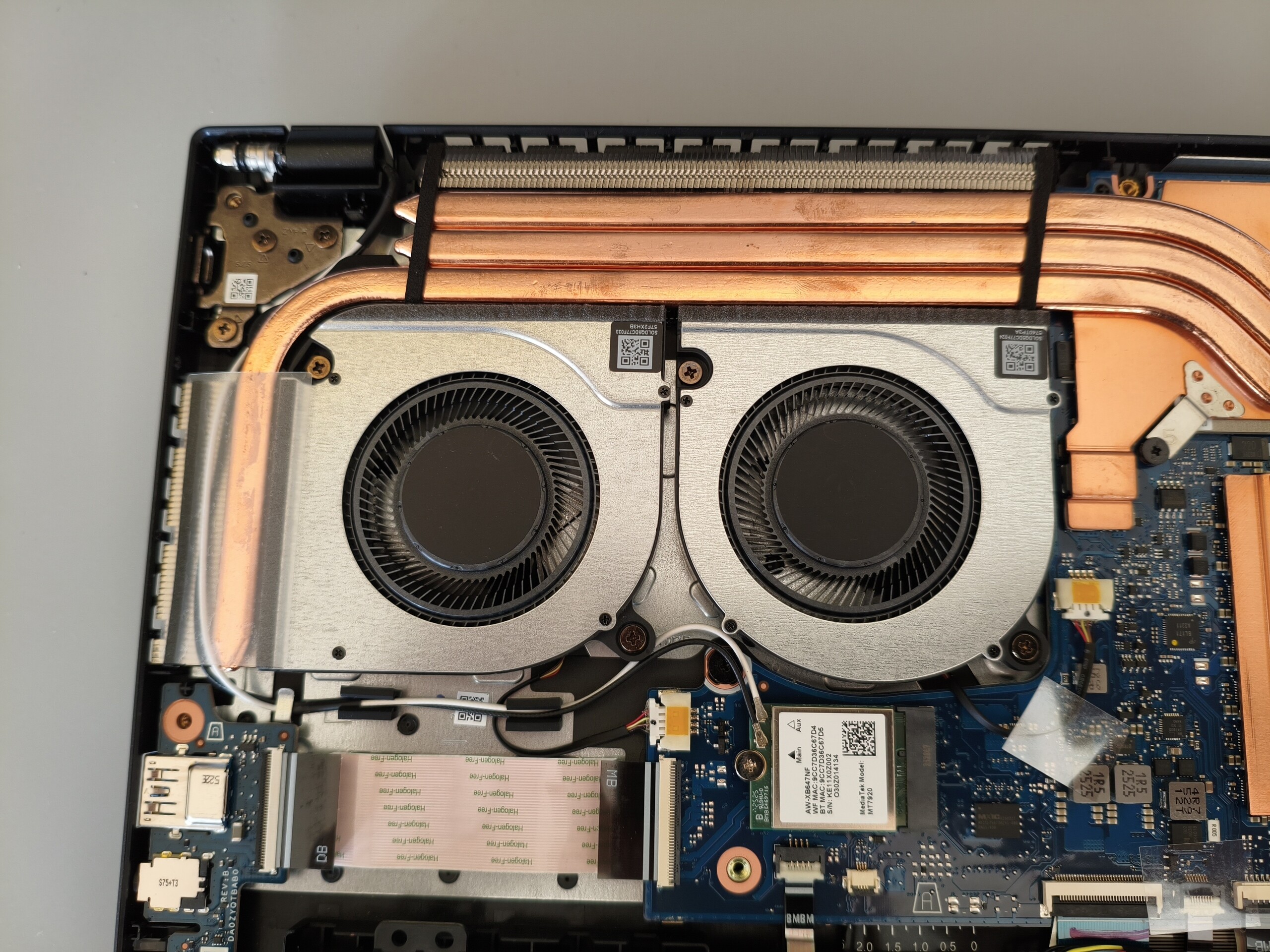 除了没有读卡器外,端口的选择几乎无可挑剔。千兆 LAN 端口、HDMI 输出和 3.5 毫米音频插孔与三个 USB-A 端口和一个 Thunderbolt 4 接口相得益彰。此外,还配备了一个 Kensington 锁插槽。Wi-Fi 6E 模块的性能一般,网络摄像头的效果也同样平平。进入内部需要拧下 11 颗十字螺丝。内部图片见下文。