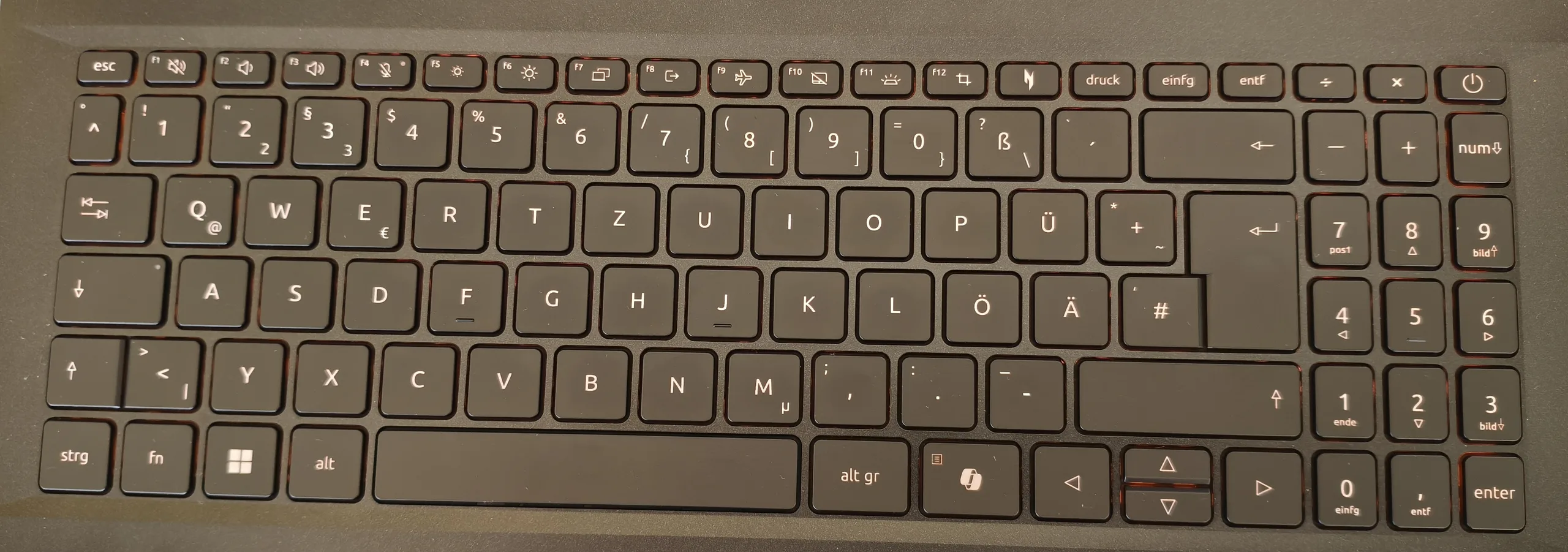 我们对键盘布局并不完全满意。值得批评的地方包括三栏数字键盘而不是完整的四栏布局,以及中央方向键相当小。打字体验是典型的橡胶圆顶键盘,因此并无特别出众之处。在背光方面也有改进的余地。即使在最高设置下,橙色背光也不是特别明亮。从好的方面看,这款 15 英寸笔记本电脑配备了一块 12.6 x 7.8 厘米的超大触摸板,不过点击时感觉有些粗糙。