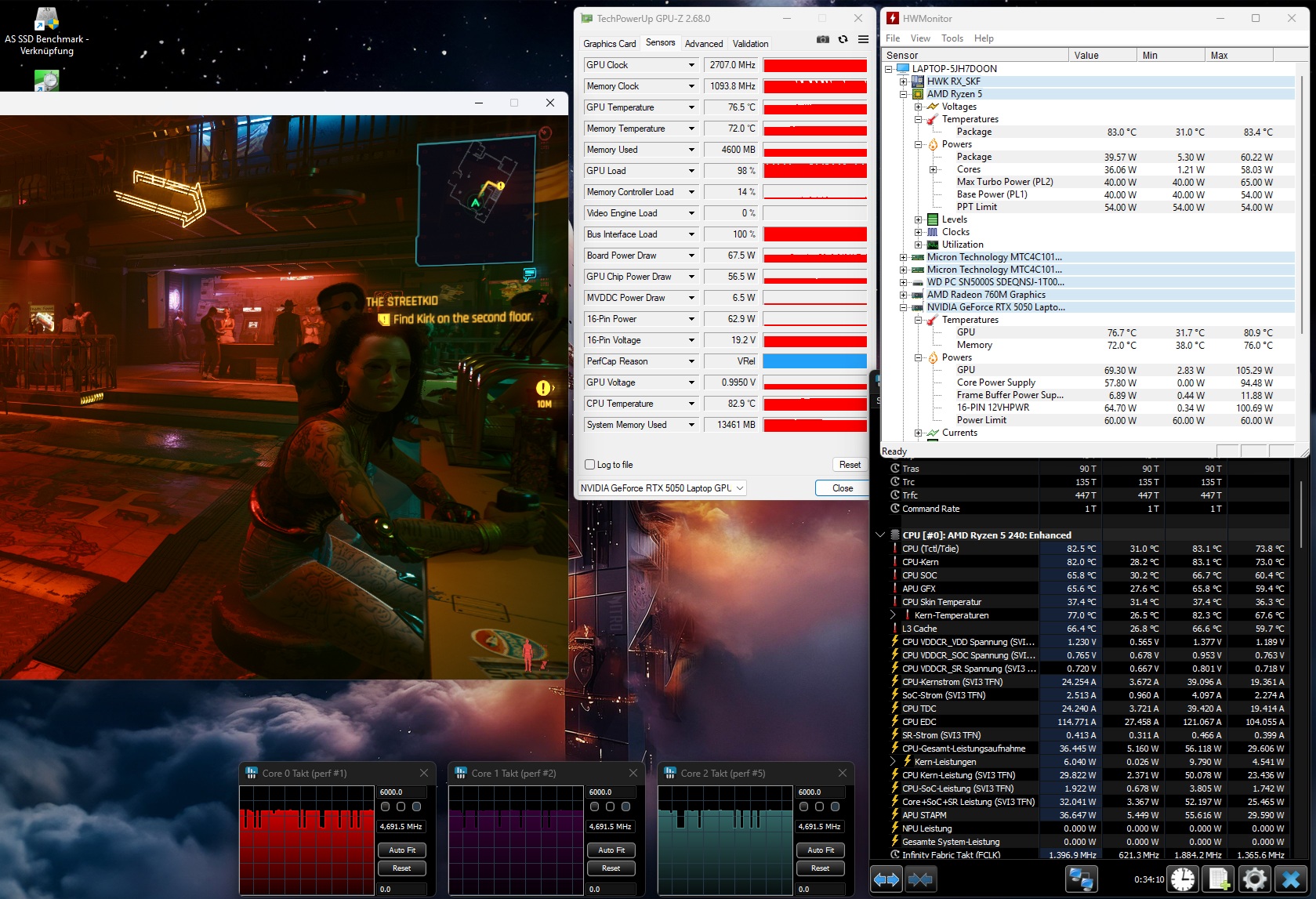 | Acer Nitro V 16 AI ANV16-42-R860 R5 240, GeForce RTX 5050 Laptop | Acer Nitro V 16 ANV16-41-R5AT R7 8845HS, GeForce RTX 4060 Laptop GPU | HP Victus 15-fa2160ng i5-13420H, GeForce RTX 5050 Laptop | Medion Erazer Scout 17 E1 MD62758 Core 5 210H, GeForce RTX 5050 Laptop | Lenovo LOQ 15AHP10 R7 250, GeForce RTX 5060 Laptop | Average of class Gaming | |