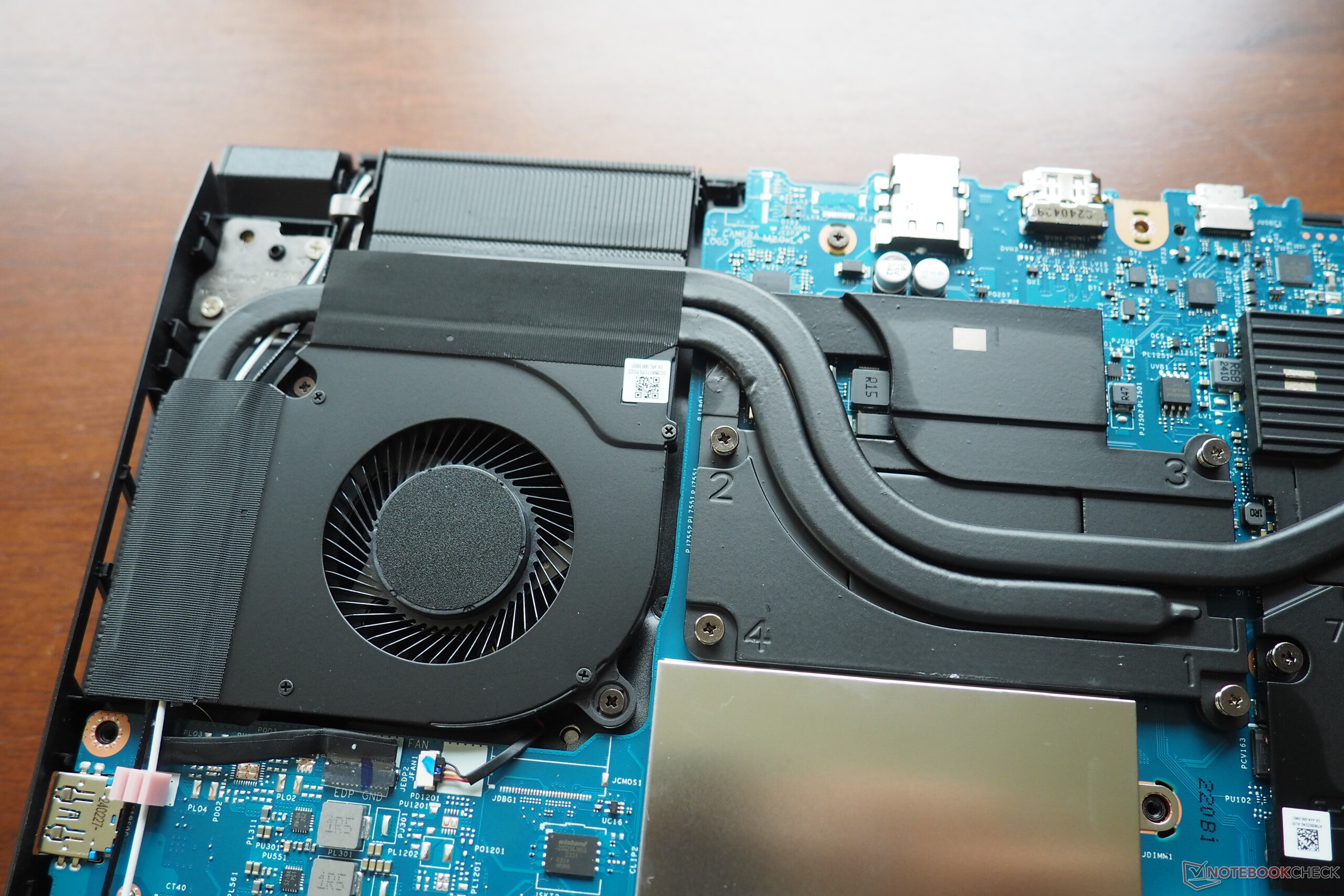 底板由 11 颗十字螺丝固定。正如开头提到的,笔记本电脑的引擎盖下有两个 M.2 插槽(其中一个是空的)和两个内存组,不过这些都隐藏在一个盖子后面。此外,还可以看到电池、无线局域网模块和冷却系统。