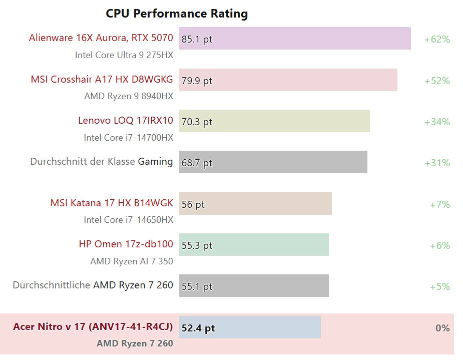 英特尔 英特尔酷睿 i7-14700HXLOQ 17 的性能要比 AMD Ryzen 7 260Nitro 中的 AMD Ryzen 7 260 要强大得多。在所有 CPU 基准测试中,联想处理器的优势约为 34%。