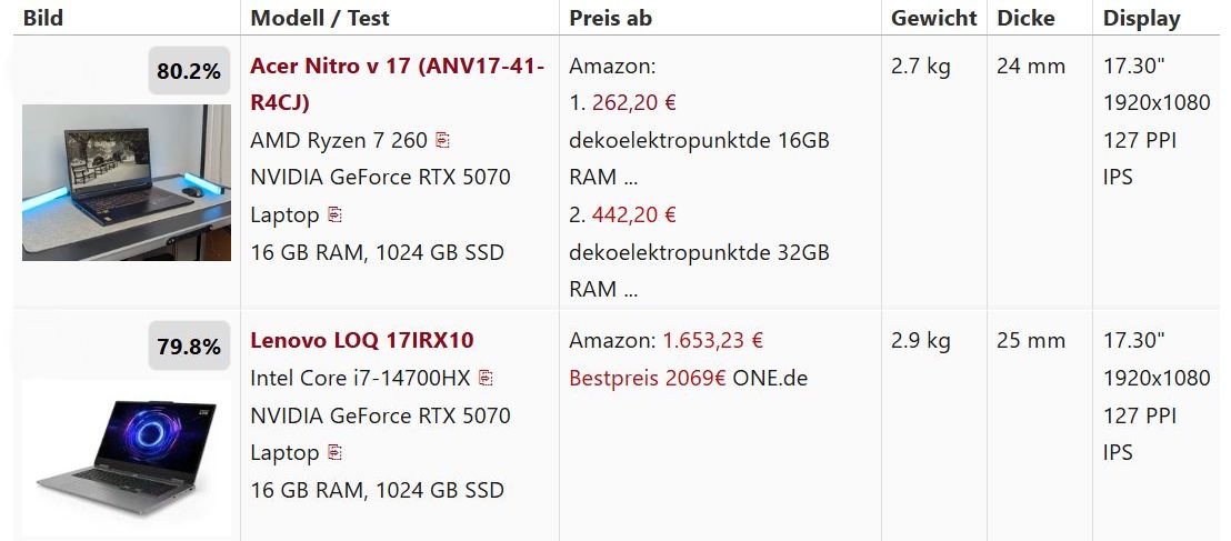 与 预兆 16是 Acer Nitro V 17和 联想LOQ 17是目前 最便宜的游戏笔记本电脑搭载 RTX 5070.相同的起步价和不同的配置让您可以直接进行比较。哪些型号的笔记本电脑最适合游戏玩家?
