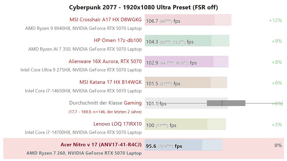 游戏性能也呈现出类似的趋势。在所有测试的游戏中,LOQ 17 的帧率平均高出约 16%。像《Dota 2 Reborn》这样重 CPU 的游戏会拉大这一差距,而在《赛博朋克 2077》的超高设置下,差距缩小到大约 5%。