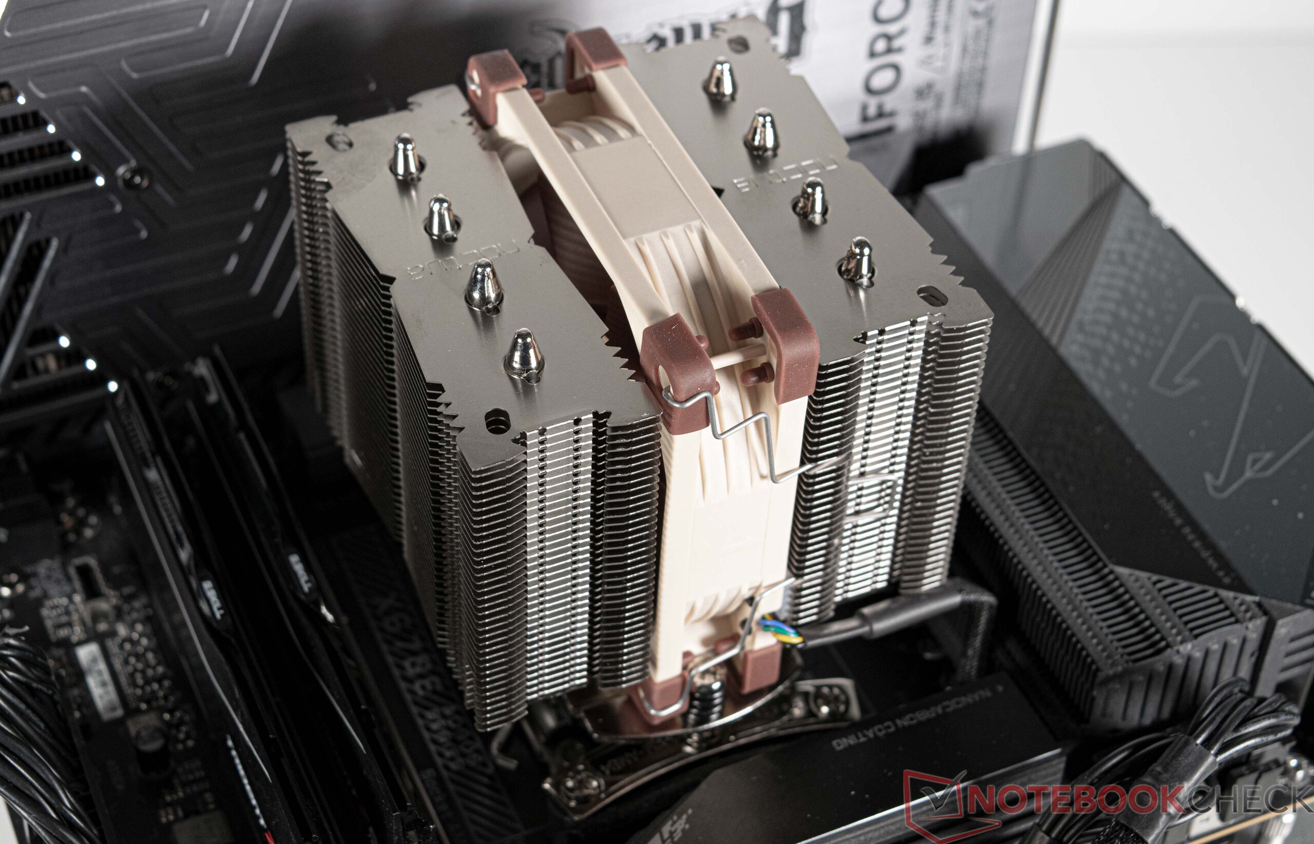 Noctua NH-D9L的构造与Noctua NH-D15相似,是一款双塔式散热器。Noctua NH-D9L总共配备了4根热管,以快速引导热量到散热片。主动冷却是由一个92毫米的风扇来处理的,该风扇就安装在两个塔楼之间。与诺克托NH-U9S一样,我们可以在一个单独的盒子里找到安装所需的一切。在我们的测试系统上的安装过程与Noctua NH-U9S类似。适当的工具,以及散热膏和两个固定夹都包括在内,以安装第二个风扇。这款散热器的制造质量符合诺克托的标准,也是完美无缺的。所有的表面都是镀镍的,这给了散热器一种优质的感觉。与其他很多诺克托亚散热器不同,诺克托亚NH-D9L没有Chromax黑色版本。