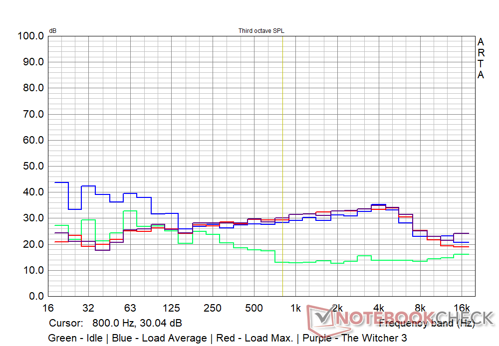 在《Witcher 3》的压力下,我们看到GPU时钟保持稳定的1,493 MHz,没有任何节流现象。虽然CPU时钟达到3.5GHz,但它们波动很大,经常下降到2.8GHz的水平。这可能解释了为什么我们在这个压力测试中看到间歇性的帧数波动,尽管GPU的运行相当稳定。