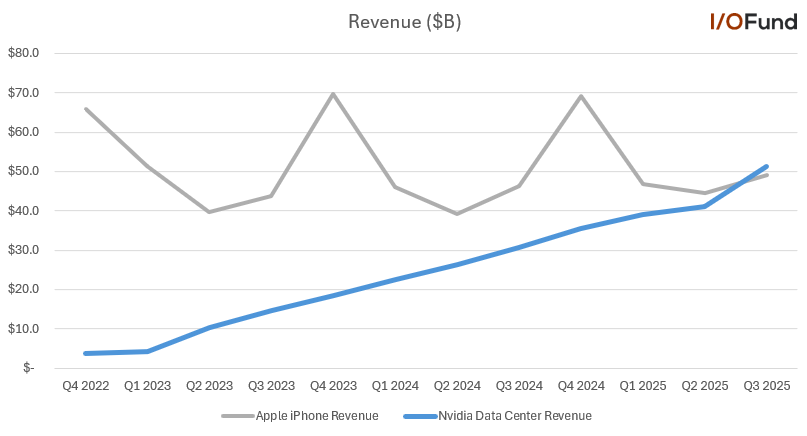 根据I/O基金(通过Beth Kindig on X),2025 年第三季度 Nvidia 的数据中心收入超过了 Apple的 iPhone的收入。