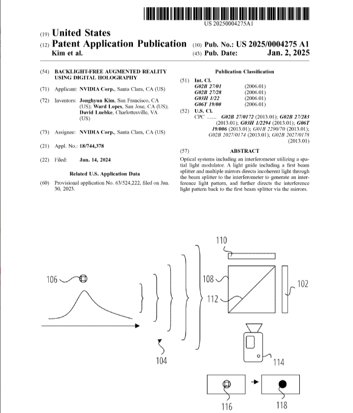 Nvidia 刚刚https://news.mydrivers.com/1/1023/1023591.htm申请了一项全新增强现实眼镜设计专利,该眼镜摒弃了常见的背光系统,转而使用数字全息技术。该专利的正式名称为 "无背光增强现实数字全息技术"(US20250004275A1),美国专利商标局于 2025 年 1 月 2 日公布了该专利。