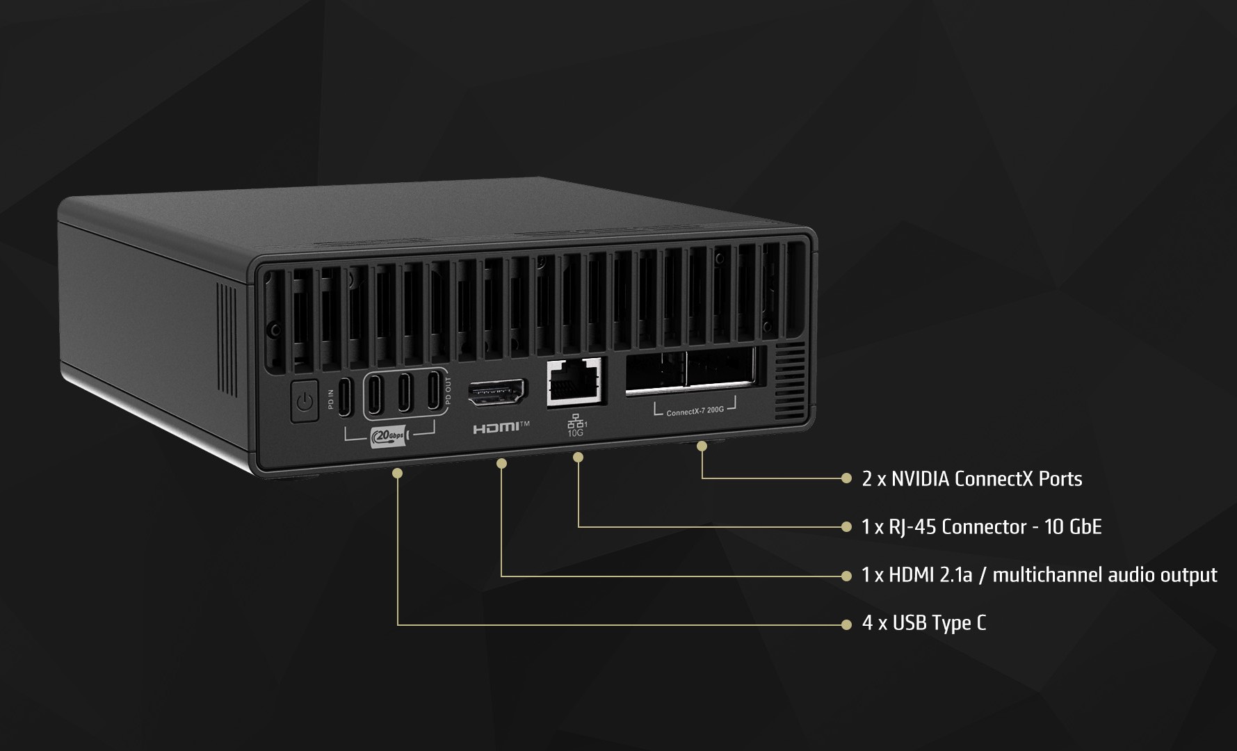端口选择包括 4 个带 PD 功能的 USB-C 3.2 20 Gbps 端口、一个带多声道音频输出的 HDMI 2.1a 视频输出端口、一个 10 GbE 网卡和 2 个 Nvidia ConnectX-7。无线连接通过 Wi-Fi 7+ BT 5.3 卡确保无线连接。