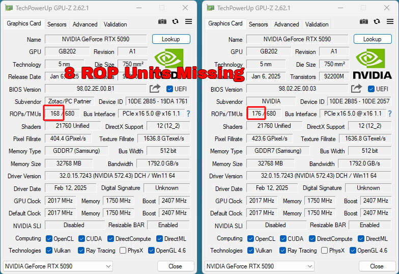 据报道,有些产品出货时只有 168 个 ROPs,比GeForce RTX 5090 应有的 ROPs 少了 8 个。ComputerBase 强调ZotacGeForce RTX 5090 Solid 不存在这个问题。尽管如此,在不开机的情况下,无法确定哪些单元受到影响。4.5% 的 ROP 降低也导致了不成比例的性能下降。